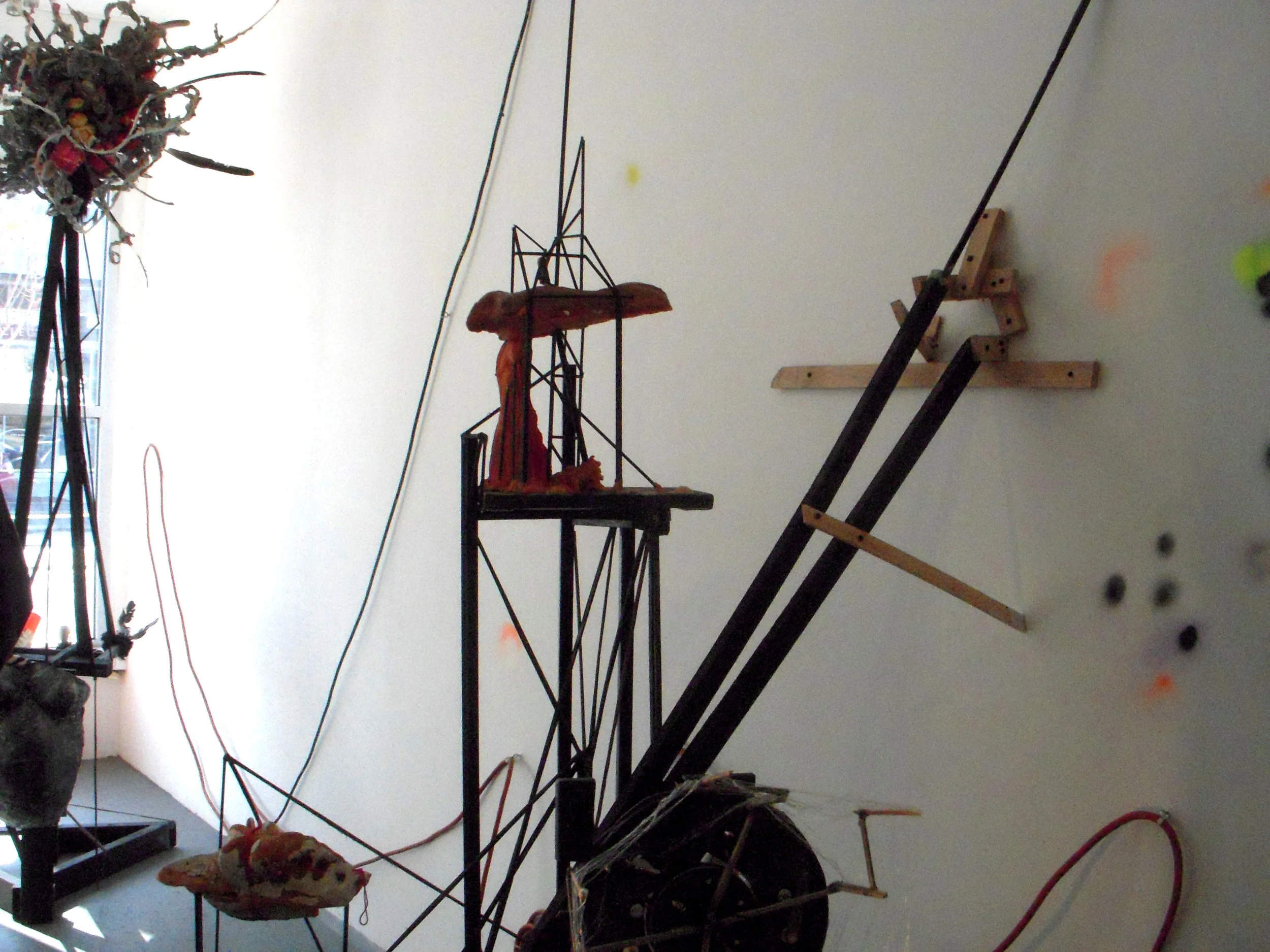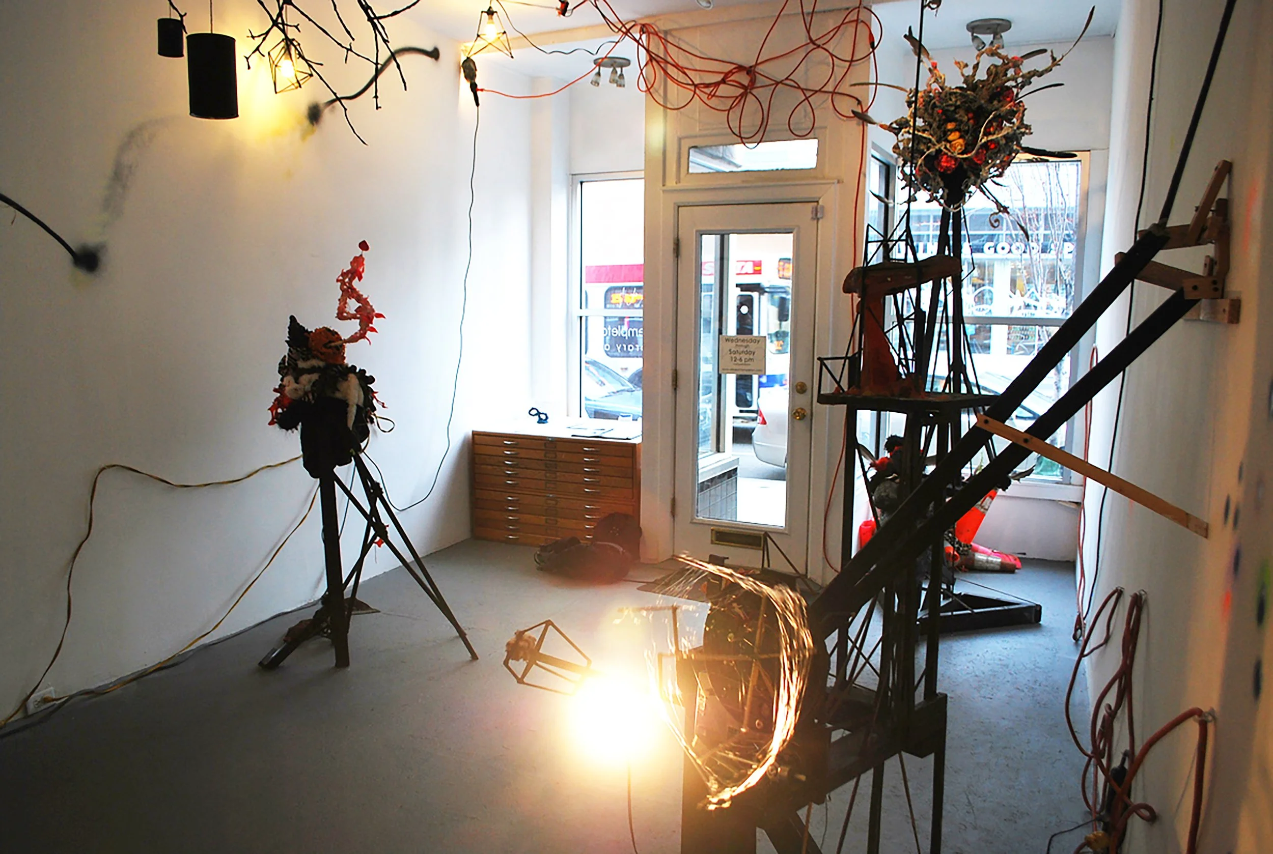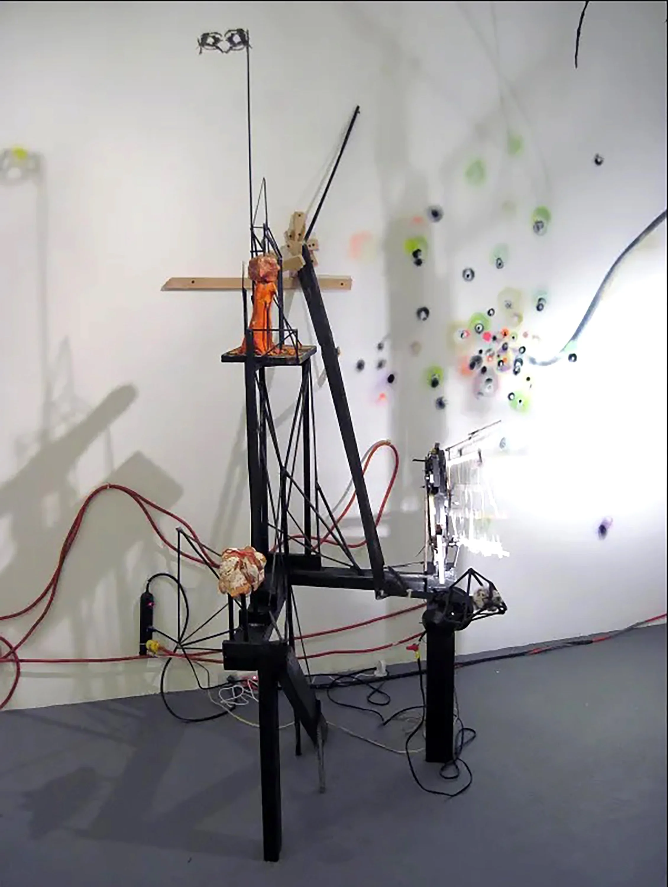 sculptural pieces, a totem, a light projected wall map, an analog computer made of