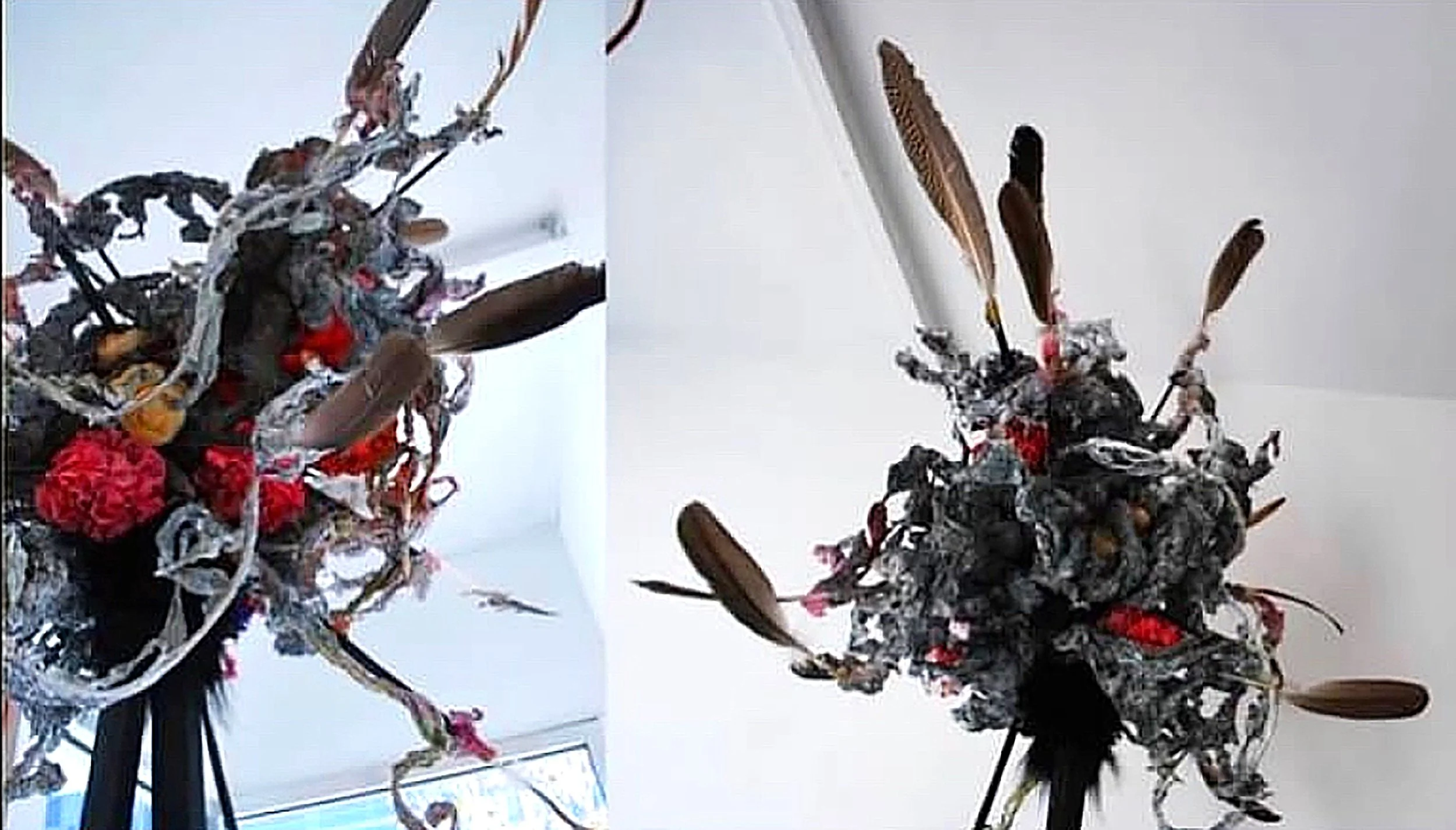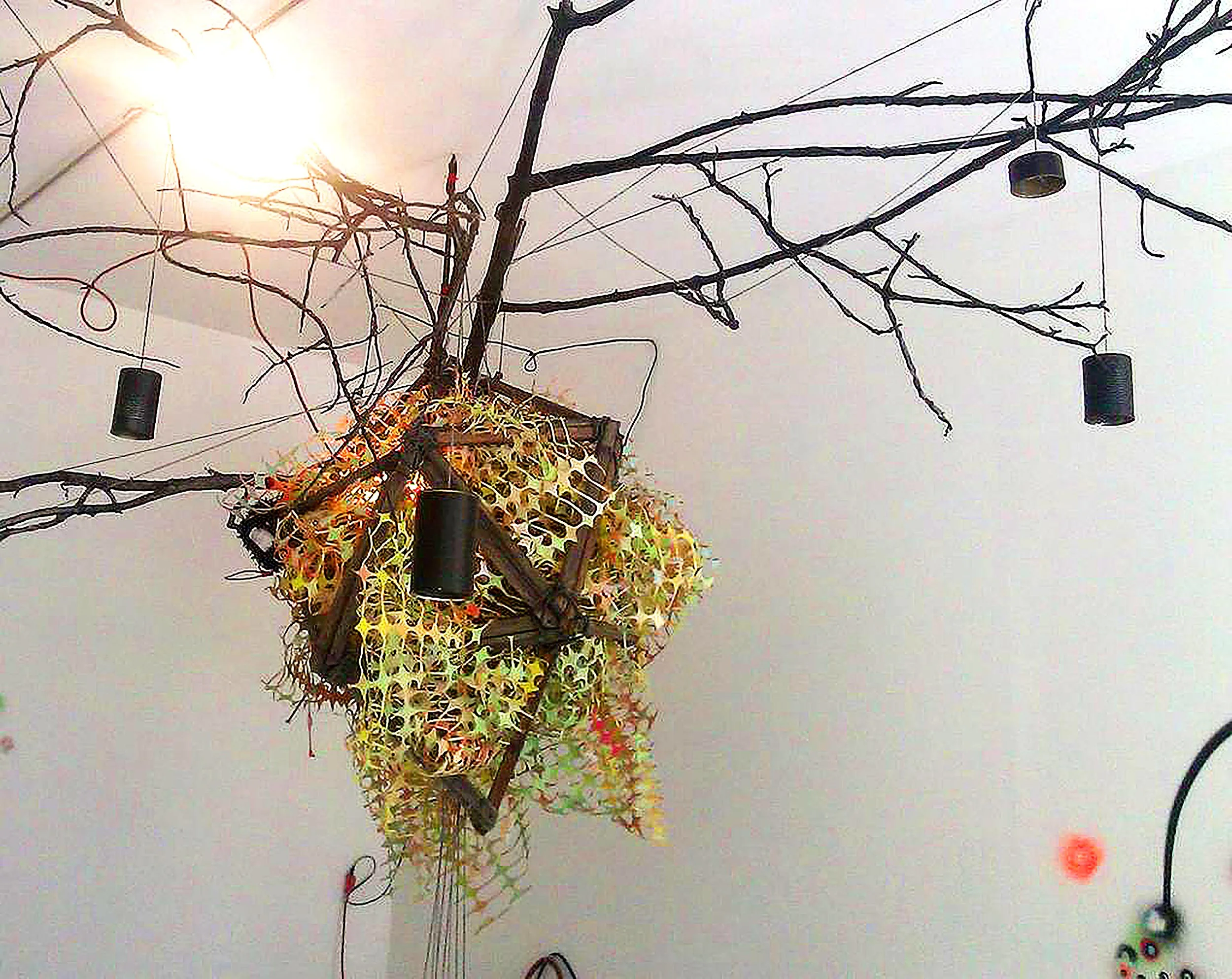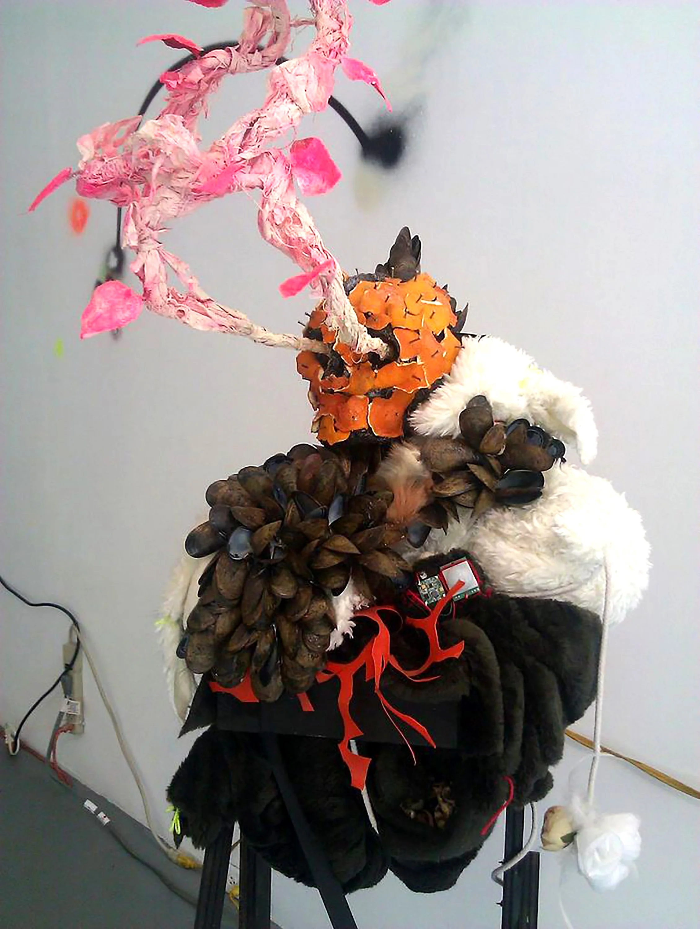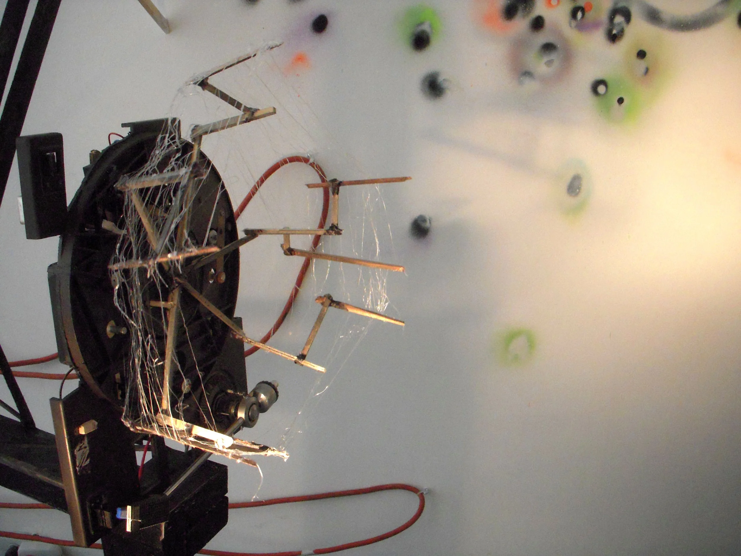 sculptural pieces, a totem, a light projected wall map, an analog computer made of
