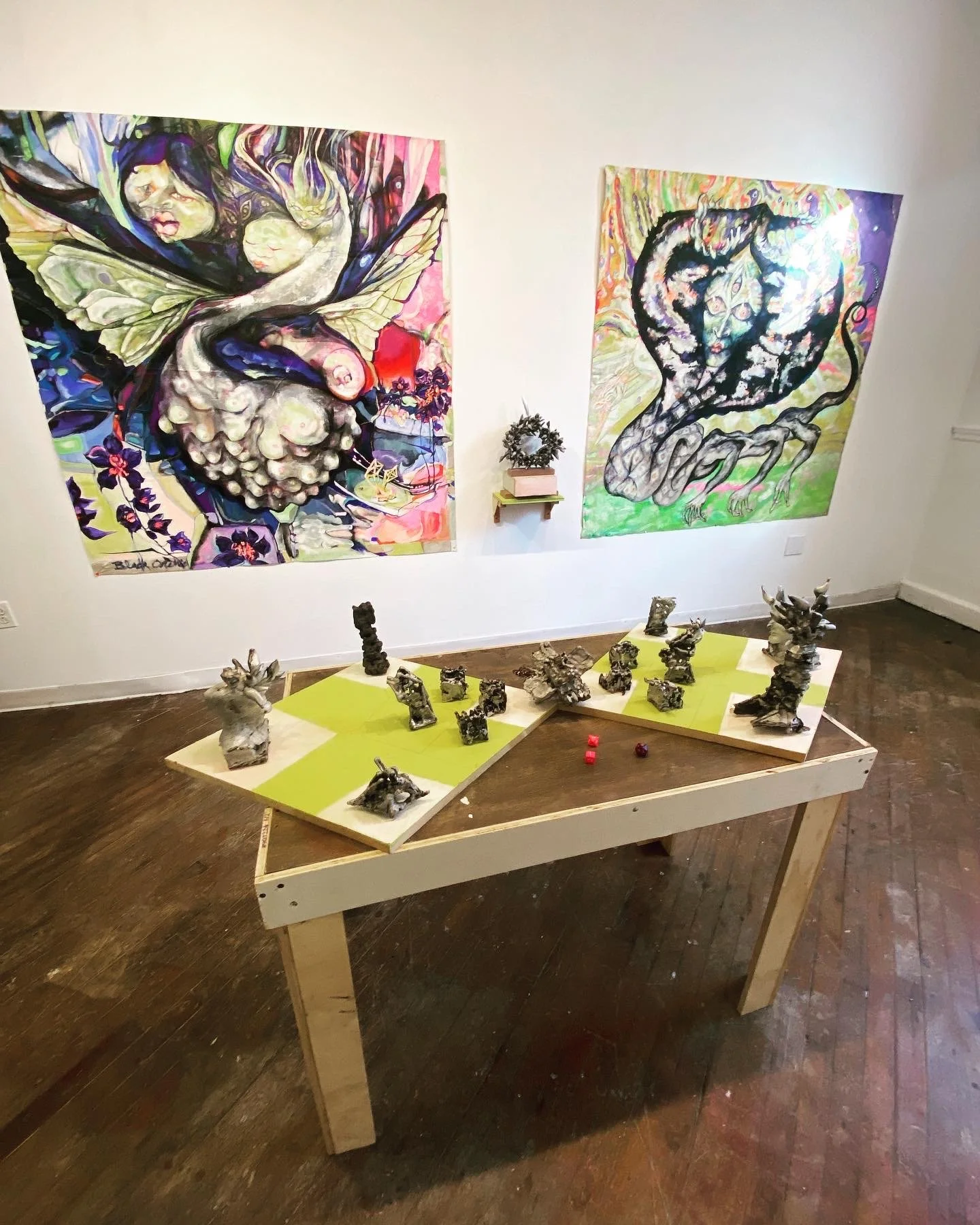 This exhibition is built upon playful instantiations, game play, and ambiguity endurance. Notions of trade and barter are integral to the process and reception. Transmutation of materials, chance, and shaping providence are outcomes achieved through disparate connections, embodied mythology, and courageous presentation.
