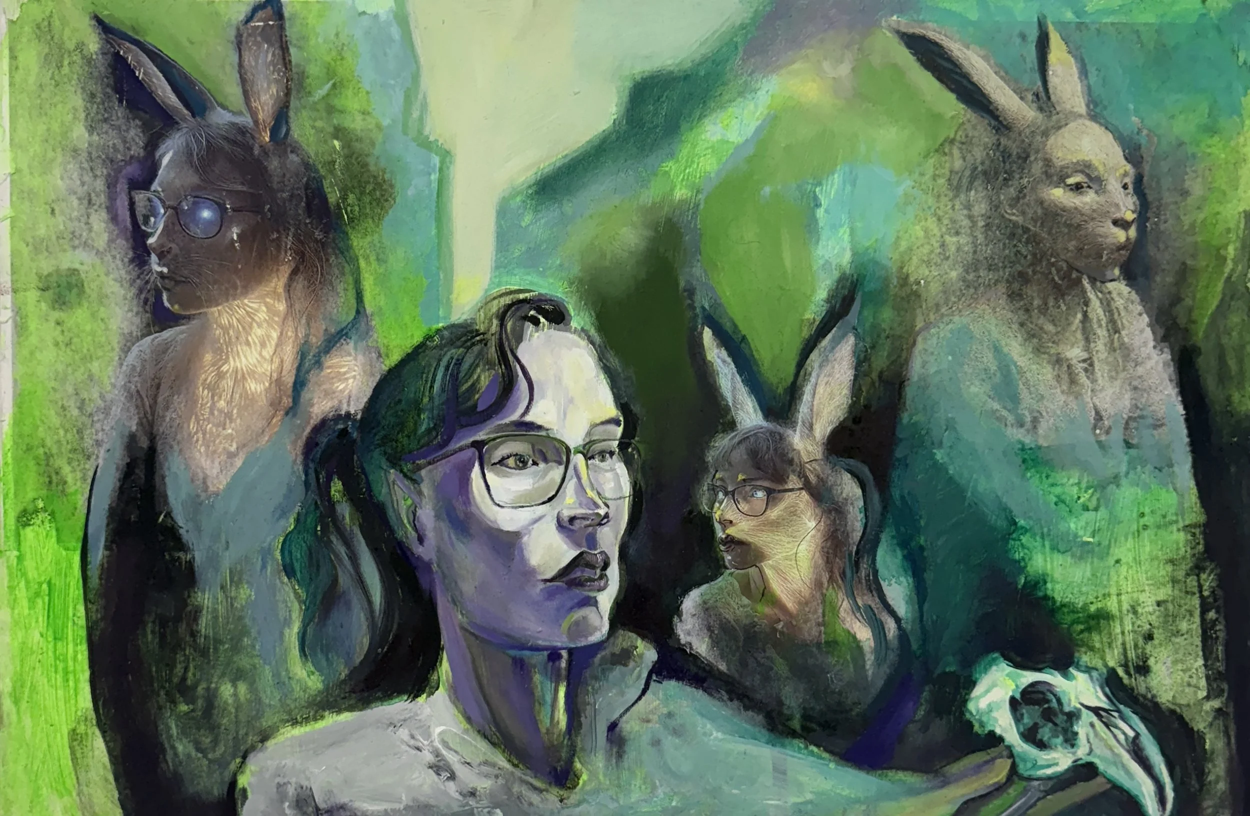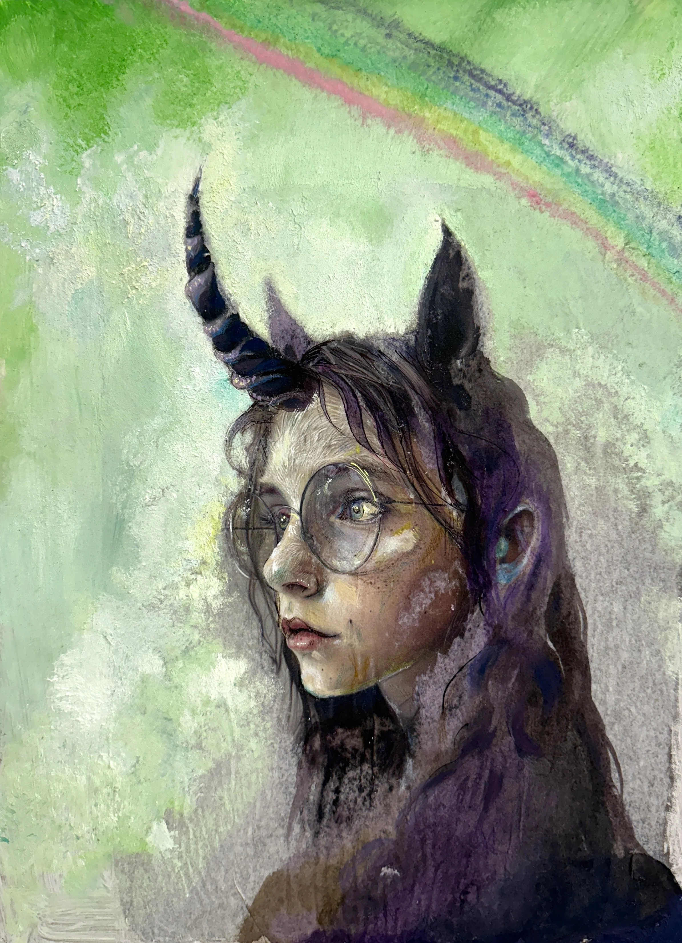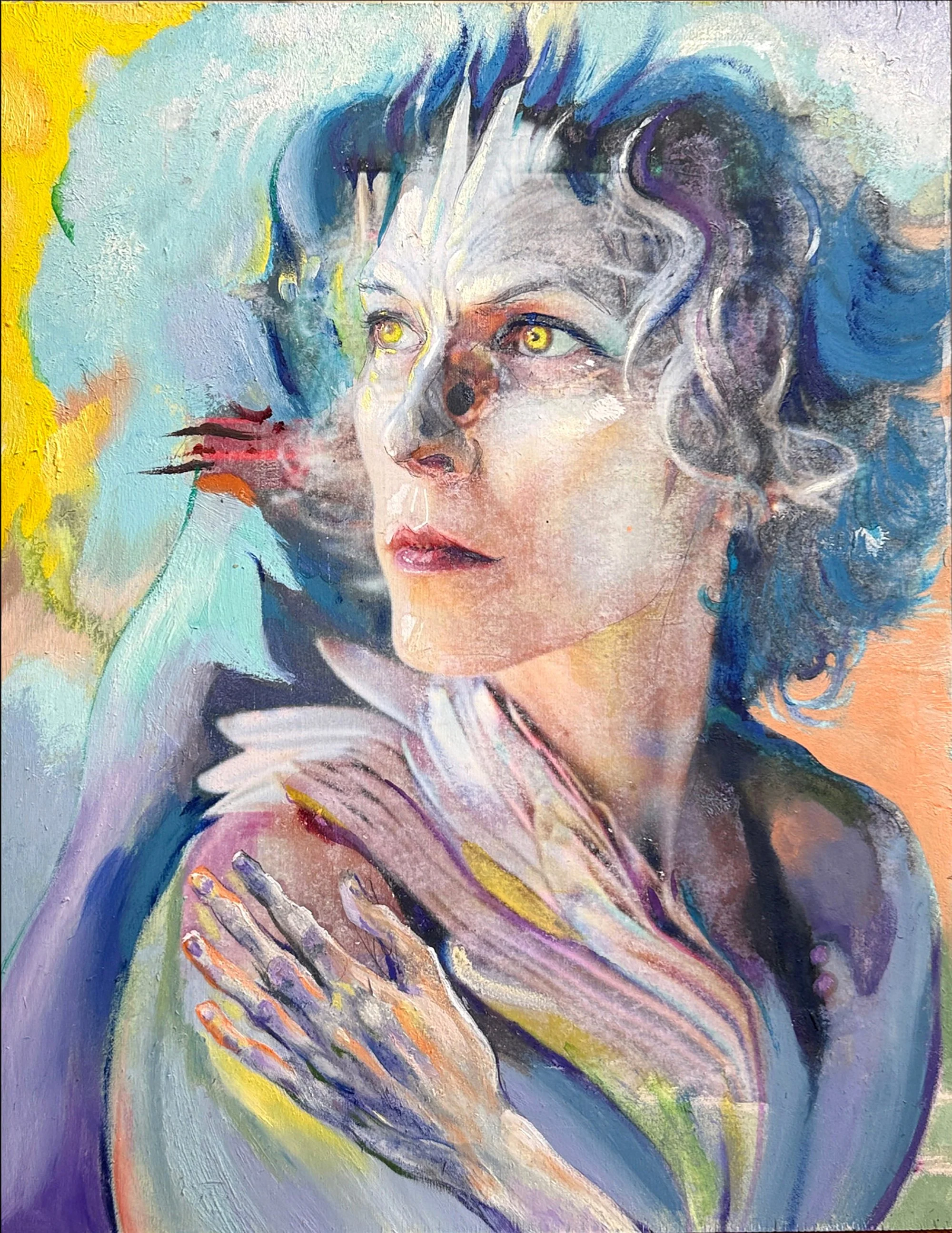 The technique folds into the conceptual framework of the exhibition, braiding technology, biology, and spiritual mythologies. The technical journey of the portraits consists first of photographing the sitters. The digital photographs are entered into Midjourney, coupled with text prompts, the AI bot responds with forms that are printed out on an inkjet printer. These prints are then transferred to board using a gesso printing method, and the image becomes a support for an oil portrait painting that becomes a soft-machine communion between sitter and painter. Photographs of the end results create the next image iteration in a positive feedback loop. In conversation with Western art history, Kline nods to the Baroque tradition of dramatic yet personal portraiture while subverting it with surreal, hybrid-sapien aesthetics. The meticulous attention to detail in the painted faces recalls German New Objectivity, particularly the movement’s focus on clarity, precision, and subjective psychological intensity. Yet, Kline tempers this mediated objectivity with layers of emotional vulnerability, reflected in the expressive eyes and gestural brushstrokes surrounding the figures.
