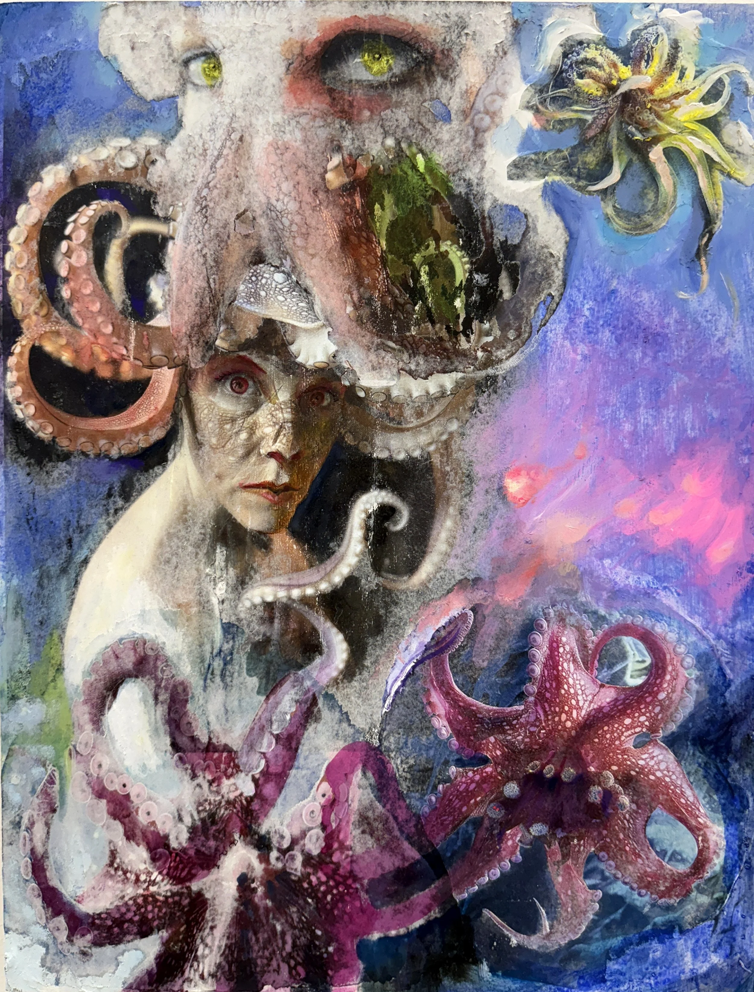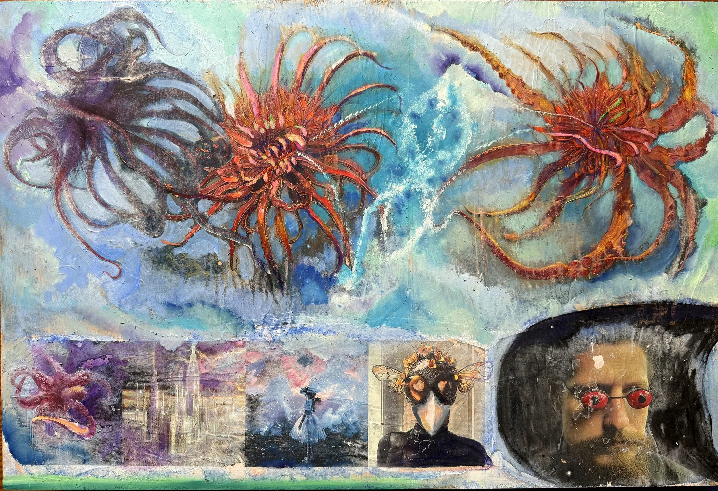 AI-assisted portrait paintings serve as one of the sequential narrative currents.The portraits—bearing intricate, biomorphic distortions and vapor-wave growths—represent individuals transformed by their contact with the Kai-Sawn, a telepathic species of cephalopods trapped beneath Europa’s icy crust. These images evoke a narrative of mutual evolution, where humans and other beings merge minds, unlocking interstellar potential through shared consciousness (Geistdenkenheit).