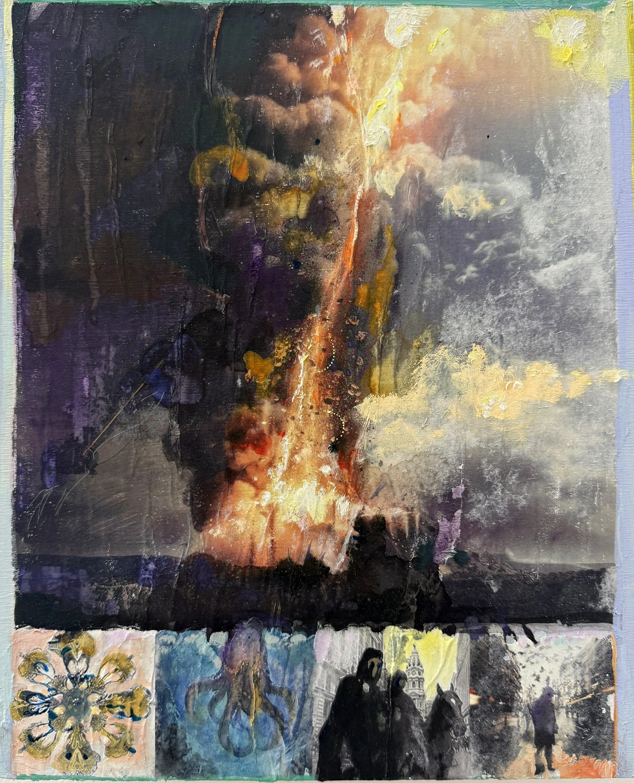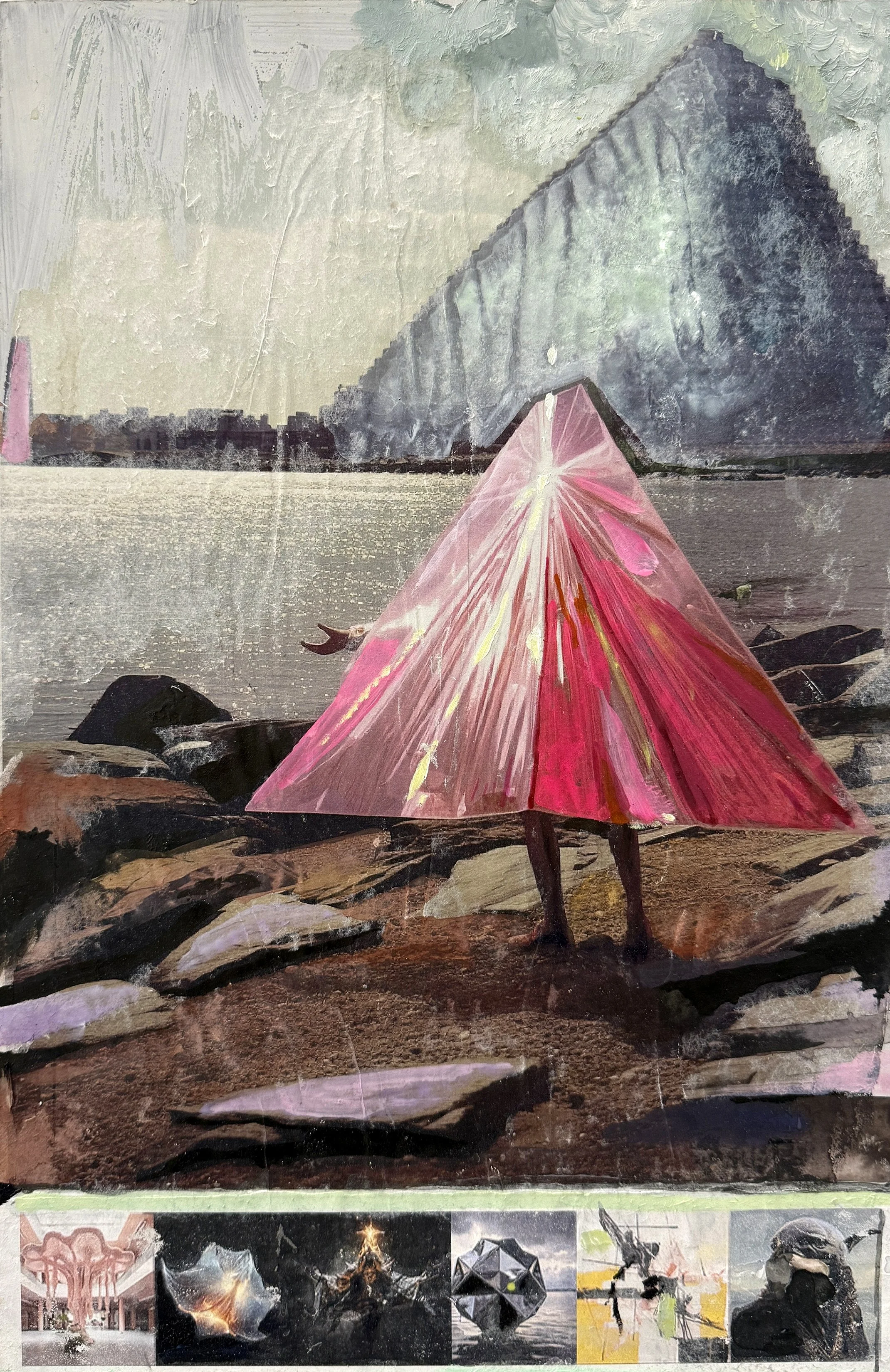 Sky Bound as Titans unfolds as a multi-dimensional epic, melding mythology, speculative science, and interspecies communion into a compelling meditation on the liminal moment in which we exist—a pivot between collapse and rebirth, the Anthropocene, Chthulucene, and the Sednacene. Channeling a hybrid sequential art narrative that traverses Earth’s environmental crises, Martian industrialization, and telepathic communion with hyper-sentient beings called the Kai-Sawn, Kline crafts a speculative cosmology that invites viewers to consider humanity’s fragile position within an interconnected universe.